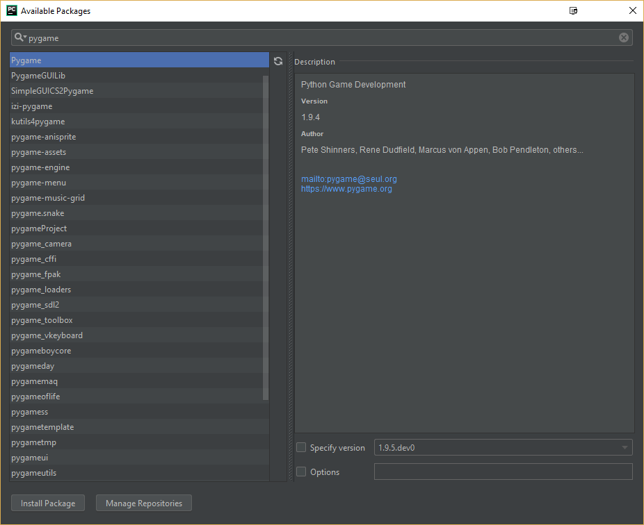 Type in “pygame” in the package search bar and then select “PyGame” from the results and click “Install Package”. Close the dialog.