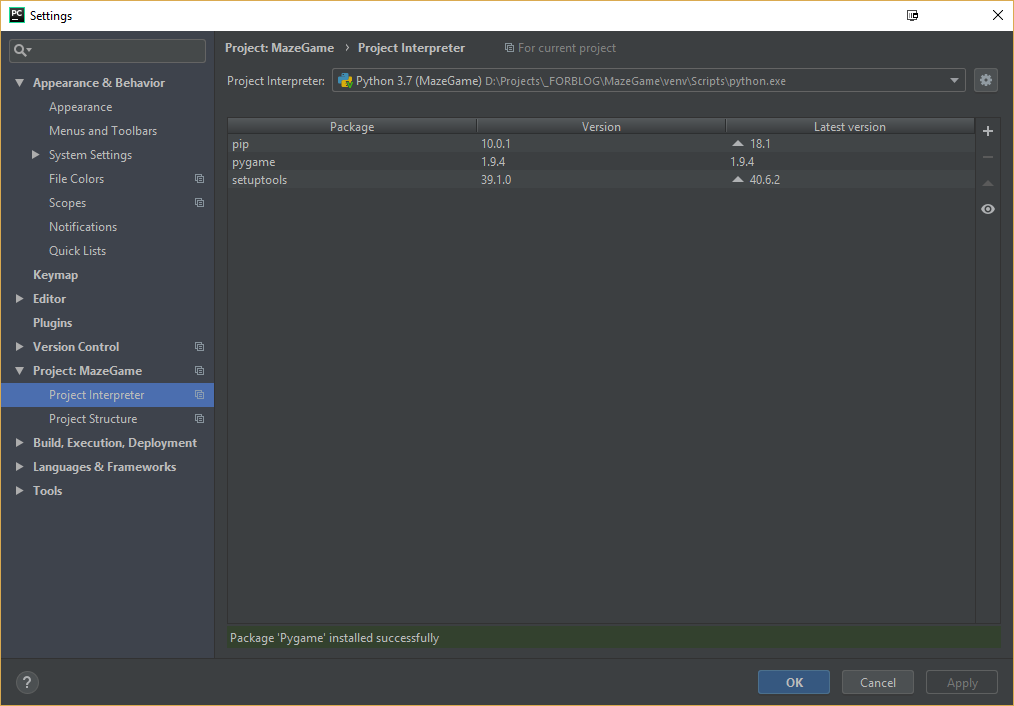 After it installs you should be back on the settings dialog and see that the PyGame package is listed under the packages. Click “OK” to close the dialog.
