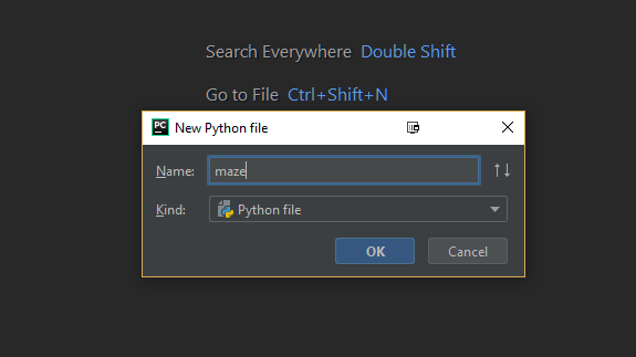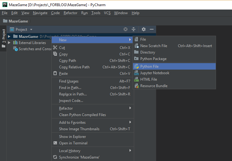 Right-click on the project name in the list on the left and choose “New->Python File”. Enter a name for the script. I’m calling mine, “maze”.