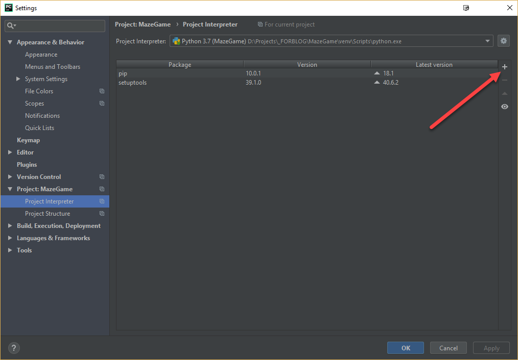 Next go to the File menu and choose “Settings…”. On the settings dialog select “Project:MazeGame”, make sure it’s expanded and select “Project Interpreter” underneath. Click the “+” next to the packages list to add a package.