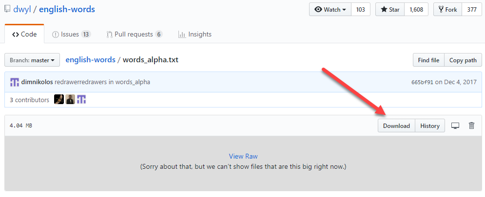 Before we beging writing any code we’ll need a list of words to use for our lookups. Any large list of words should work but here is one I found, Click here and then click on the “Download” button to download a copy of the words list. If clicking on the “Download” button just brings up the list of words in the browser then just right-click on the list and choose “Save as” and save the “words_alpha.txt” to your computer. This list contains around 479k English words which will really test our algorithm’s performance.